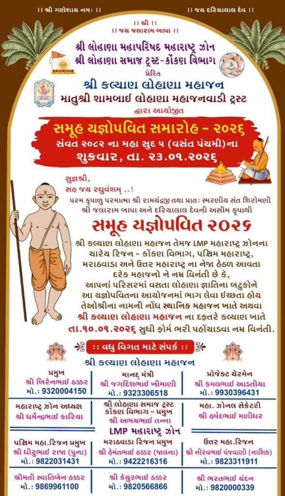 The event is jointly organized by Shri Lohana Mahaparishad, Maharashtra Zone, and Shri Lohana Samaj Trust – Kokan Division, under the guidance of Shri Kalyan Lohana Mahajan and Late Shri Rambhai Lohana Mahajanwadi Trust. The ceremony will be conducted on Thursday, 23rd January 2026, on the auspicious occasion of Magh Sud 4 (Vasant Panchami), following all traditional Vedic rituals and procedures in a disciplined and devotional manner.