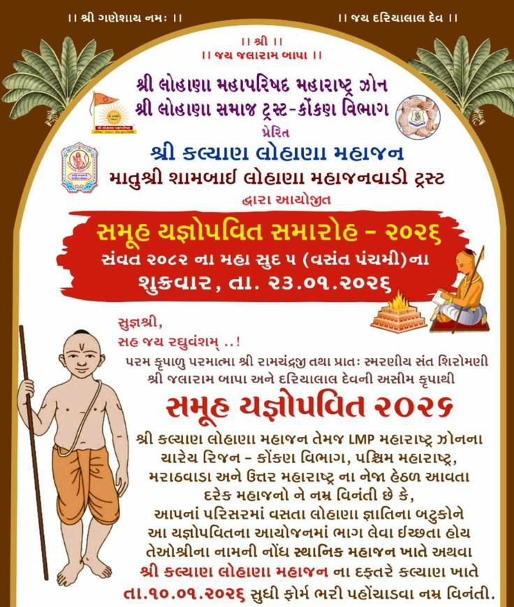 Children from Kokan Division, Western Maharashtra, Marathwada, and North Maharashtra will be given the opportunity to participate in this mass ceremony. Lohana families residing in nearby and surrounding regions are respectfully invited to enroll their children and take advantage of this well-organized and spiritually enriching event. This initiative aims to preserve cultural values, strengthen community bonds, and provide equal opportunity for families to perform this sacred ritual with dignity and devotion.